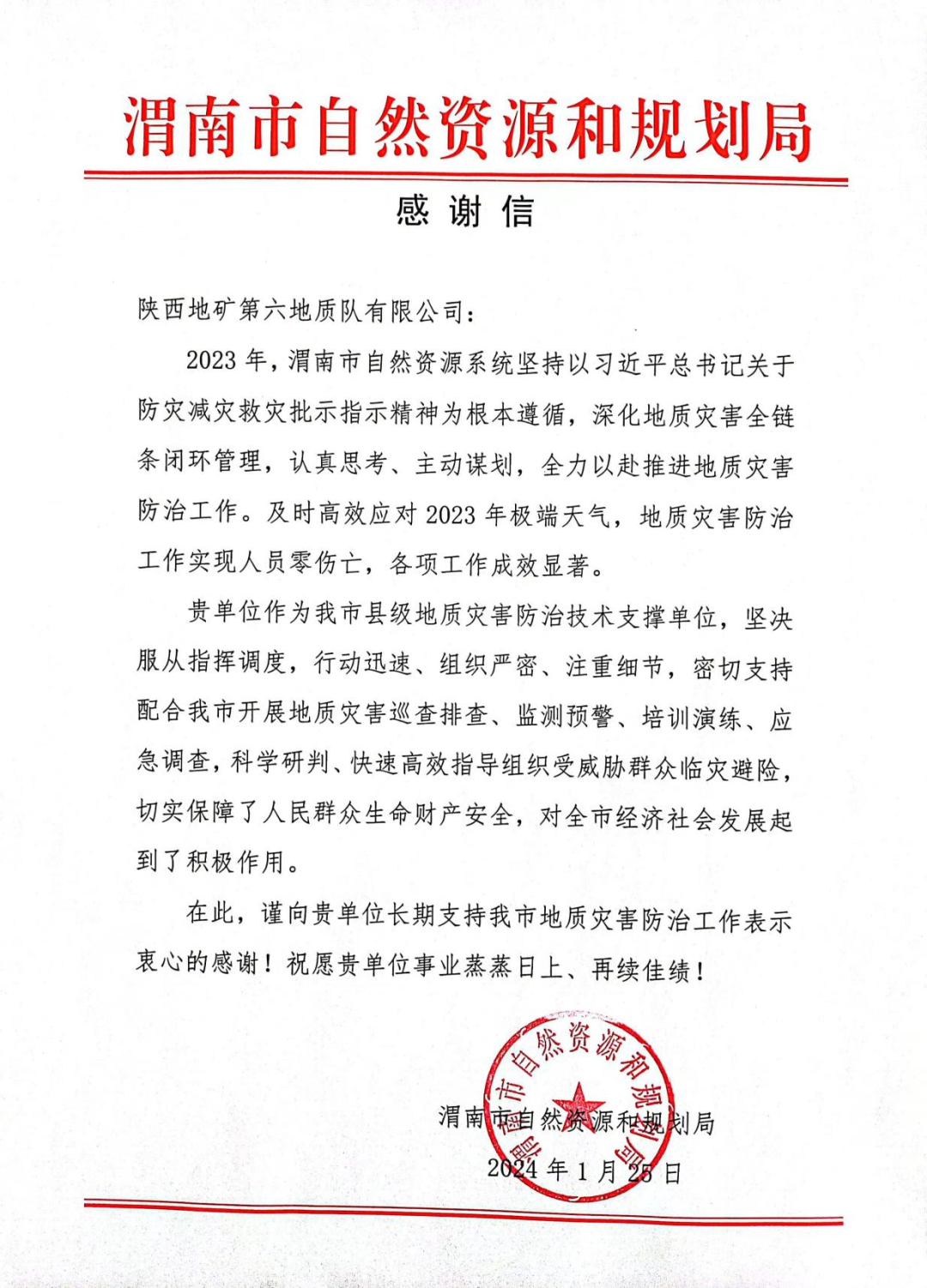 渭南市自然資源和規(guī)劃局向我公司發(fā)來感謝信