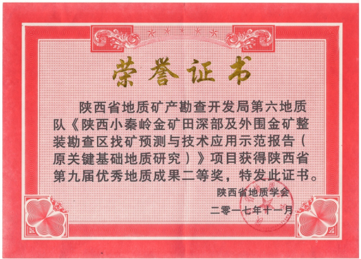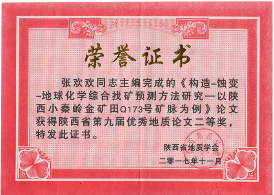 由我隊編制完成的“陜西省小秦嶺金礦田深部及外圍金礦整裝勘查區(qū)找礦預測與技術應用示范(原關鍵基礎地質研究項目)報告”獲陜西省第九屆優(yōu)秀地質成果二等獎;該隊地質調查所張歡歡同志撰寫的“構造-蝕變-地球化學綜合找礦預測方法研究—以陜西小秦嶺金礦田Q173號礦脈為例”一文獲優(yōu)秀地質論文二等獎。