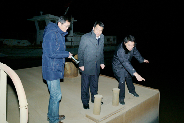 夜晚的黃河浮橋上冷風刺骨,氣溫低達-8℃。馬貴鎖指揮長與龐濤處長根據(jù)浮橋結(jié)構(gòu),研究部署攔截壩敷設(shè)方法。全體突擊隊員與渭南市、合陽縣環(huán)保局工作人員從大卡車上卸下鋼絲繩、扳手、鉗子、活性炭包等器材器具,隨時準備敷設(shè)攔截壩。