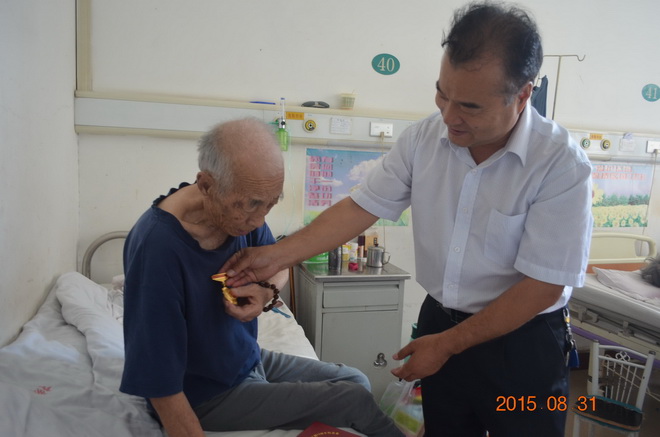 在臨潼417醫院病房,黨委書記與抗戰老兵阮恩紀一起回憶革命戰爭時期的崢嶸歲月和中國共產黨走過的光輝歷程,同時還關切地詢問他的病情及康復情況,囑咐他要積極配合醫生治療、保重身體。