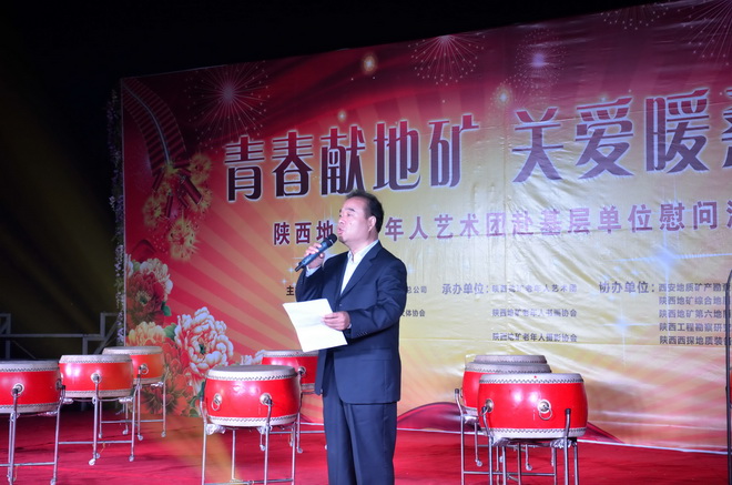 2015年10月19日下午十九點三十分由陜西省地質(zhì)礦產(chǎn)開發(fā)總公司、陜西地礦總公司老年人文體協(xié)會主辦的“青春獻(xiàn)地礦 關(guān)愛暖桑榆”重陽節(jié)下基層慰問演出在我隊舉行。總公司副總經(jīng)理艾亞雄、副總工程師王根寶及總公司有關(guān)部門負(fù)責(zé)人、部分兄弟單位的領(lǐng)導(dǎo)、我隊領(lǐng)導(dǎo)班子成員一同觀看了演出。隊黨委書記王戰(zhàn)社發(fā)表了熱情洋溢的致辭。
